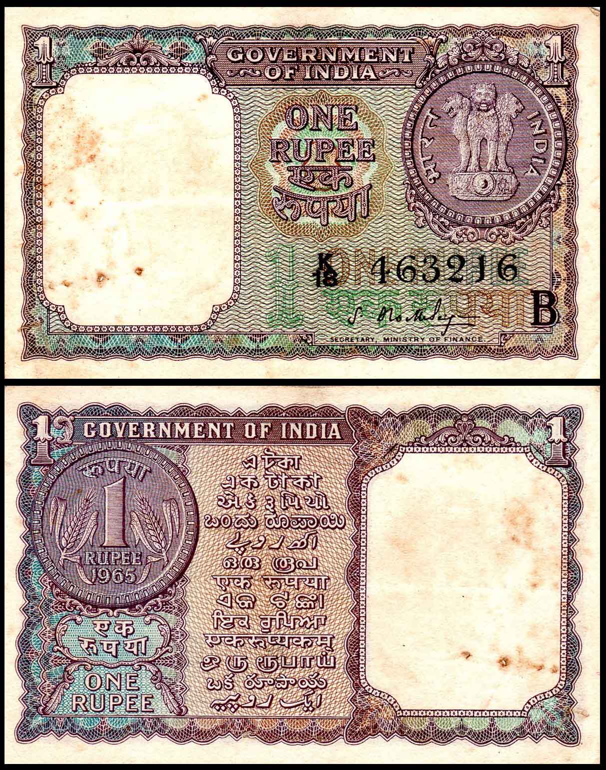 India 1 Rupee Finance Secretary S. Bhoothalingam Prefix - K Inset - B Used Banknote Year 1965