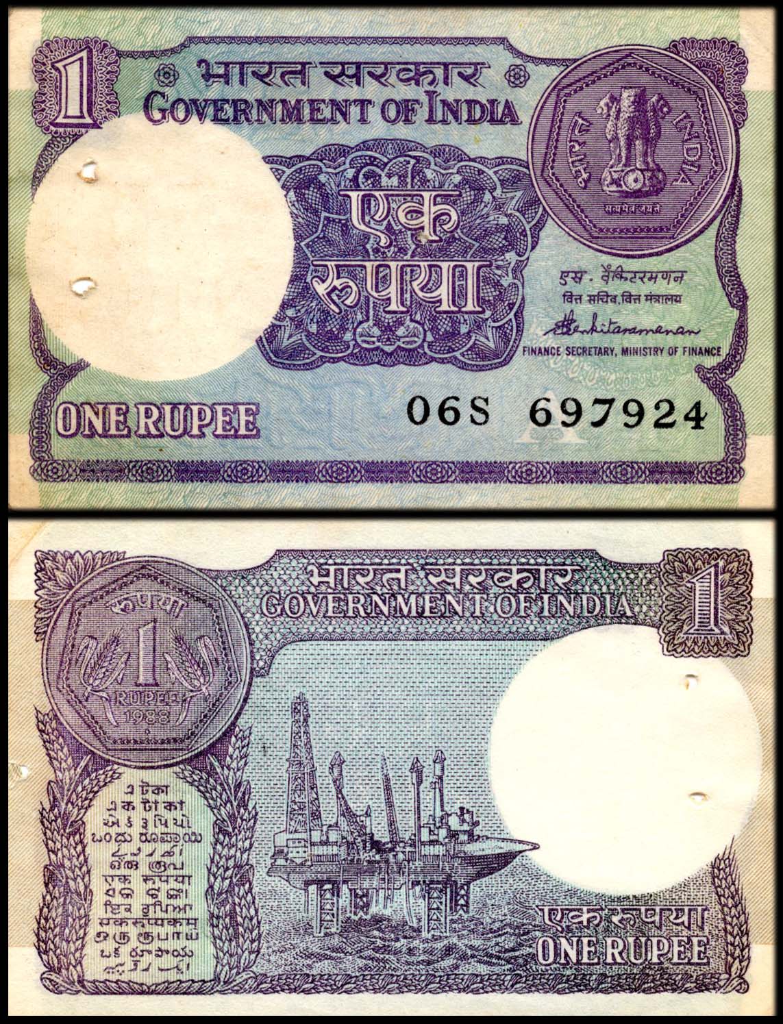 India 1 Rupee Finance Secretary S. Venkitaramanan Used Banknote