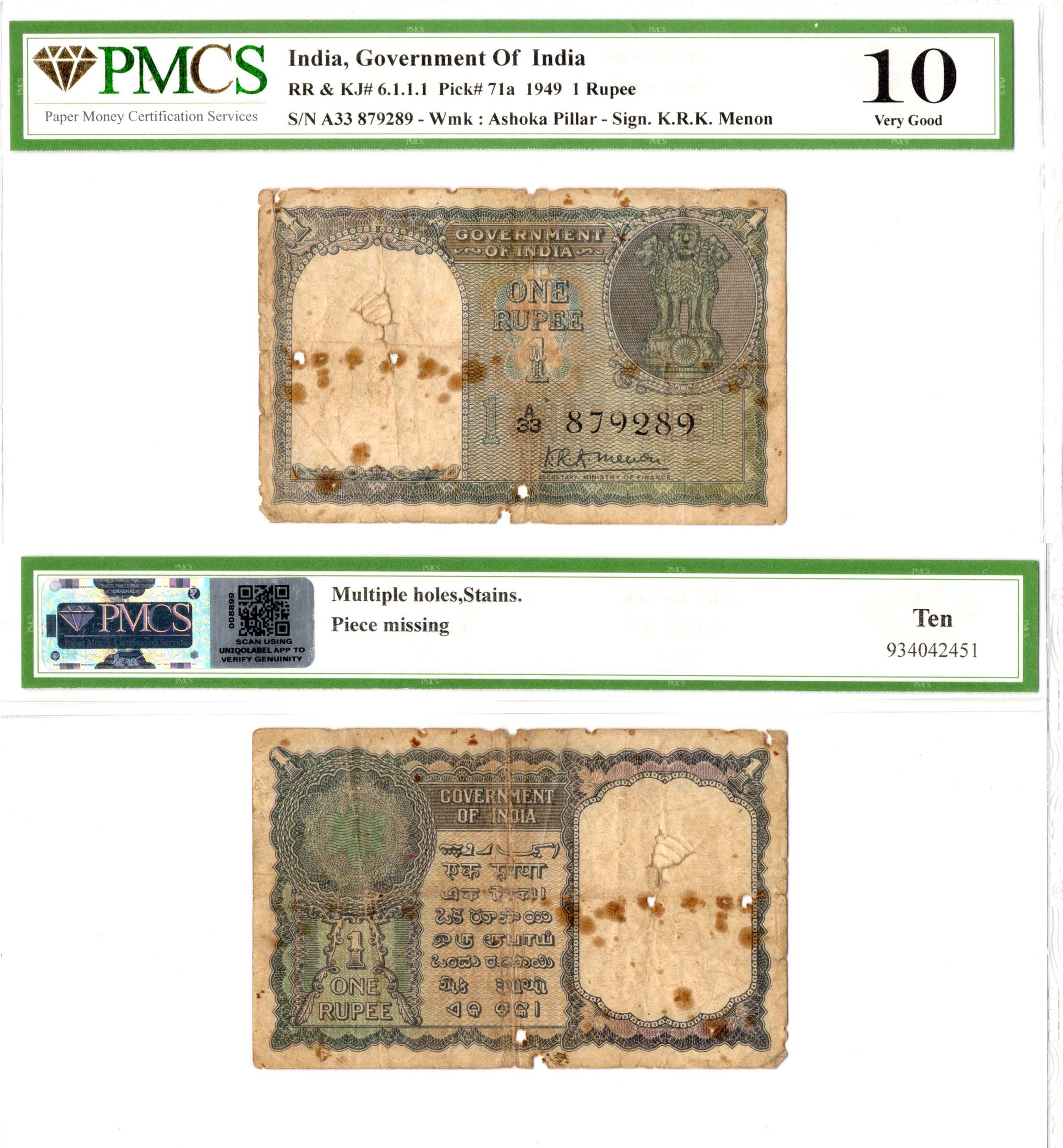 India 1 Rupee Governor K R K Menon Used Banknote PMCS Graded