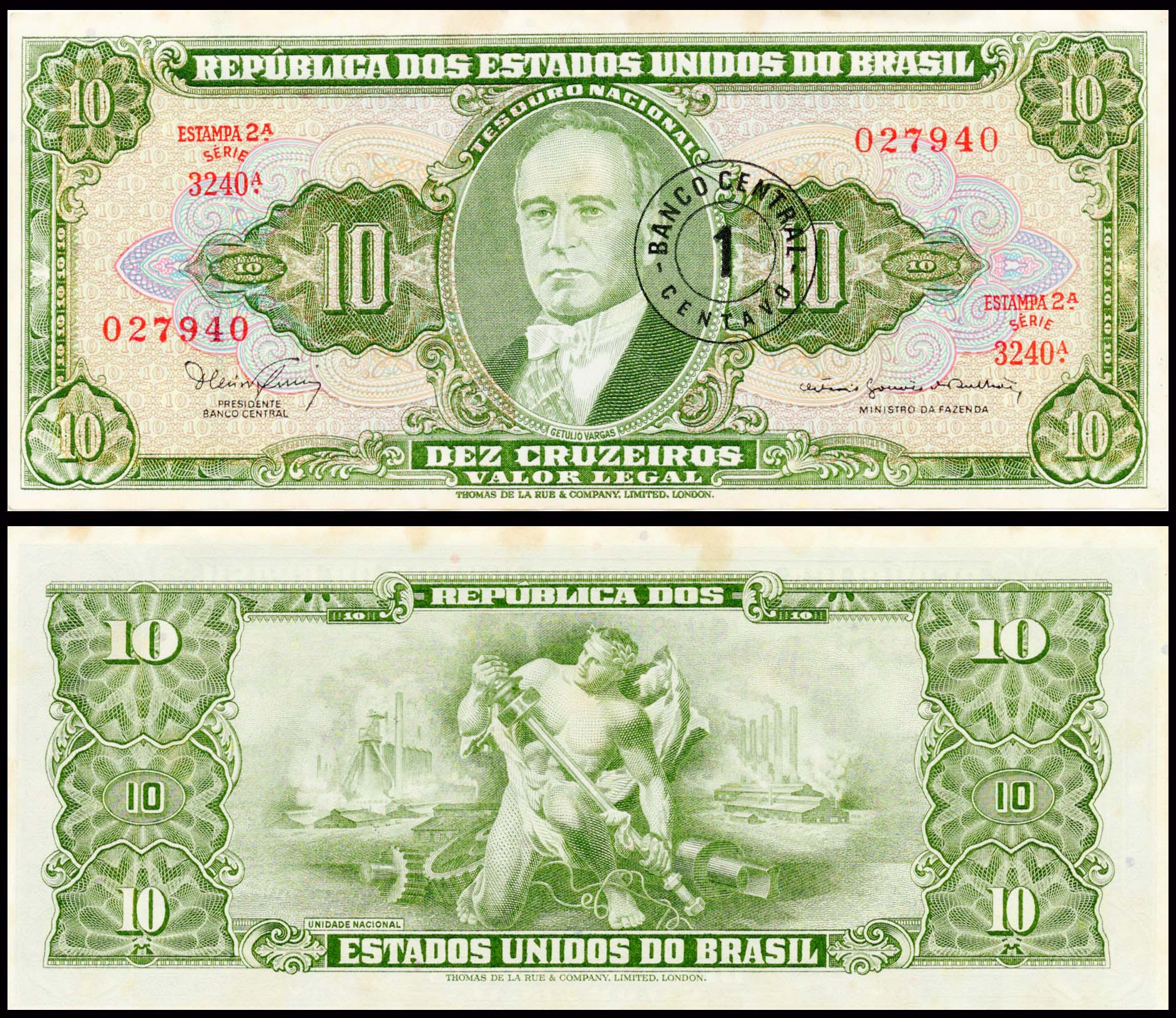 Brazil 10 Cruzeiros Very Used Banknote M141