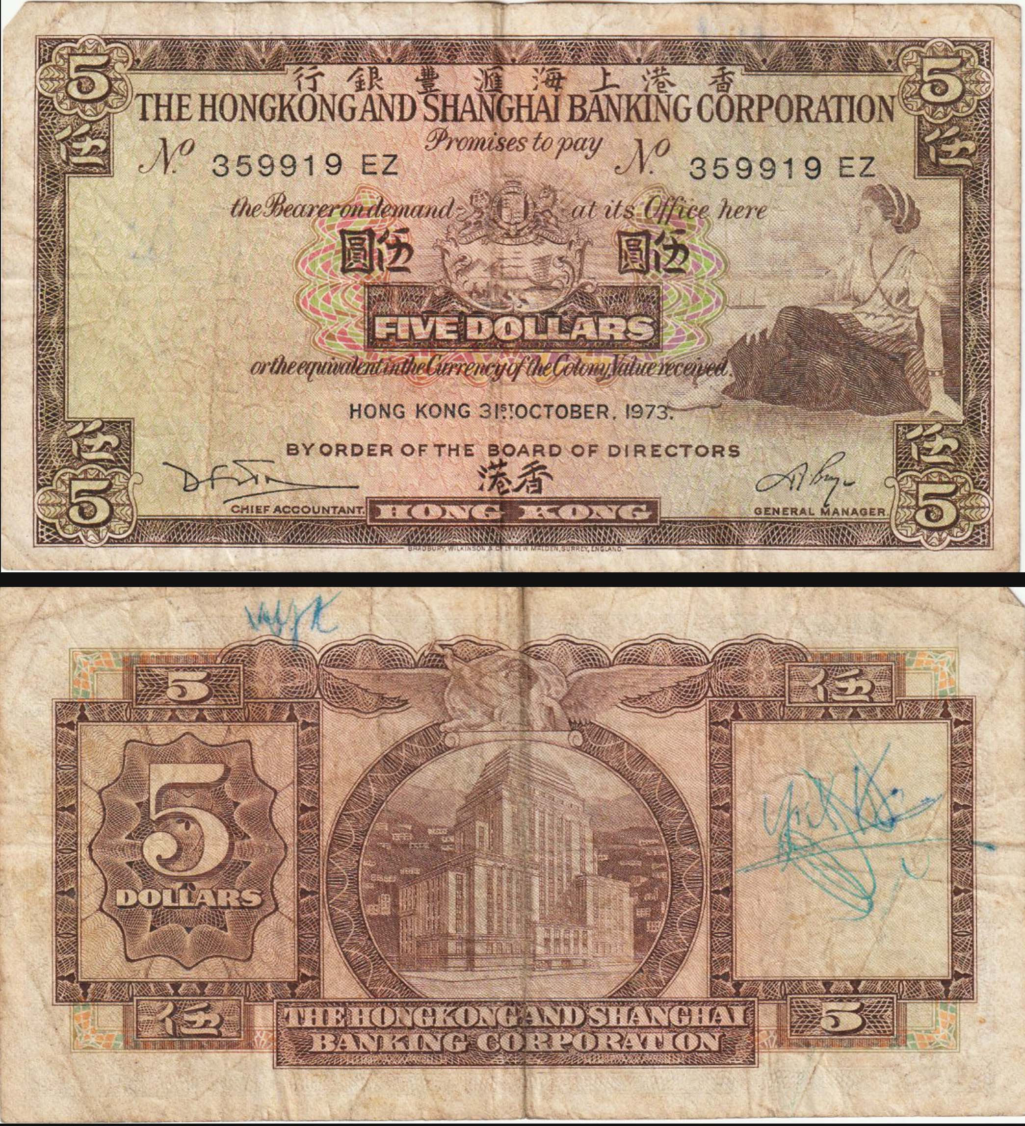 British Hong Kong 5 Dollars Banknote 31st 1973 Queen Elizabeth II Era Very Used & Damaged Banknote