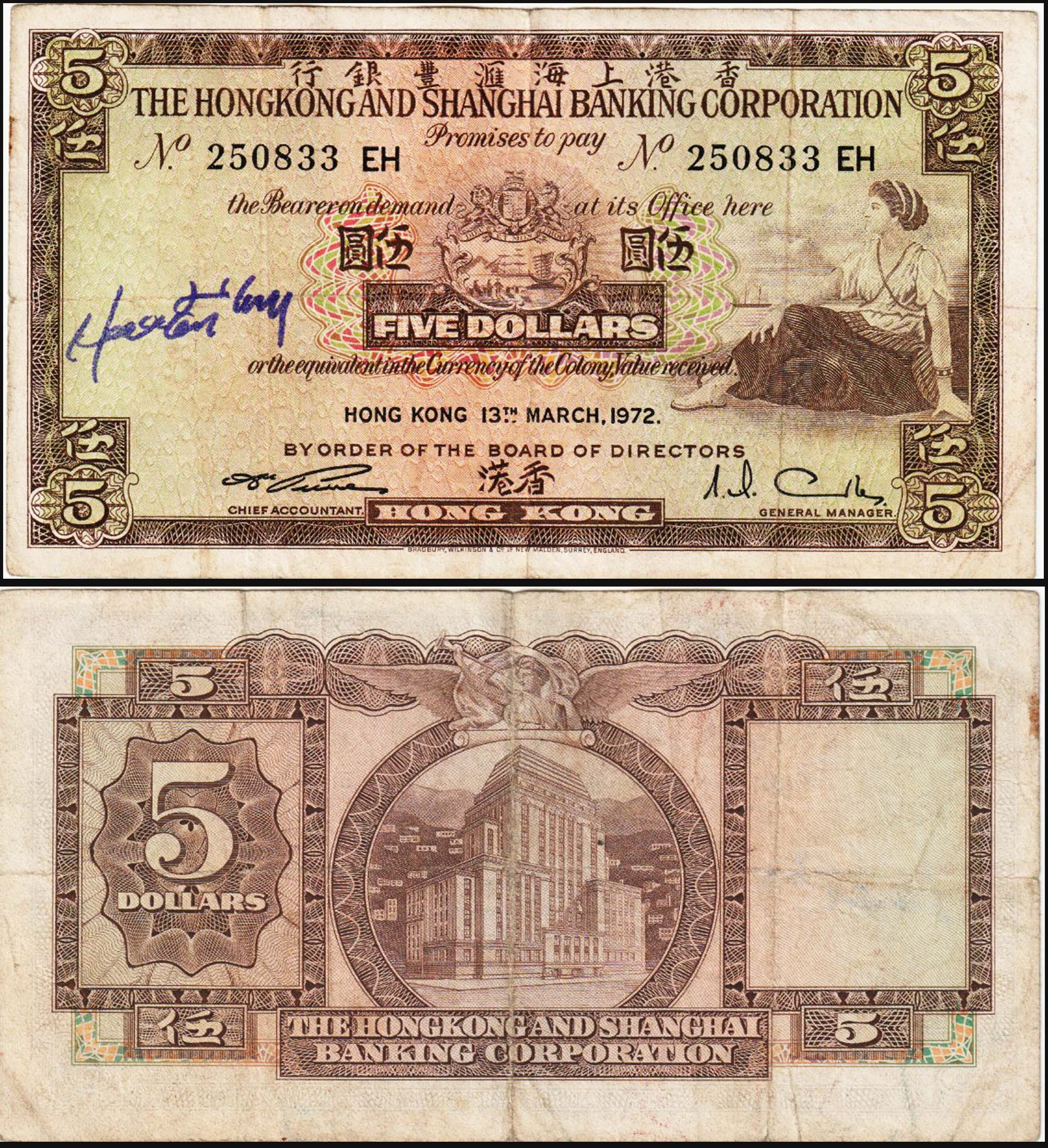 British Hong Kong 5 Dollars Banknote 1972 Queen Elizabeth II Era Very Used Banknote