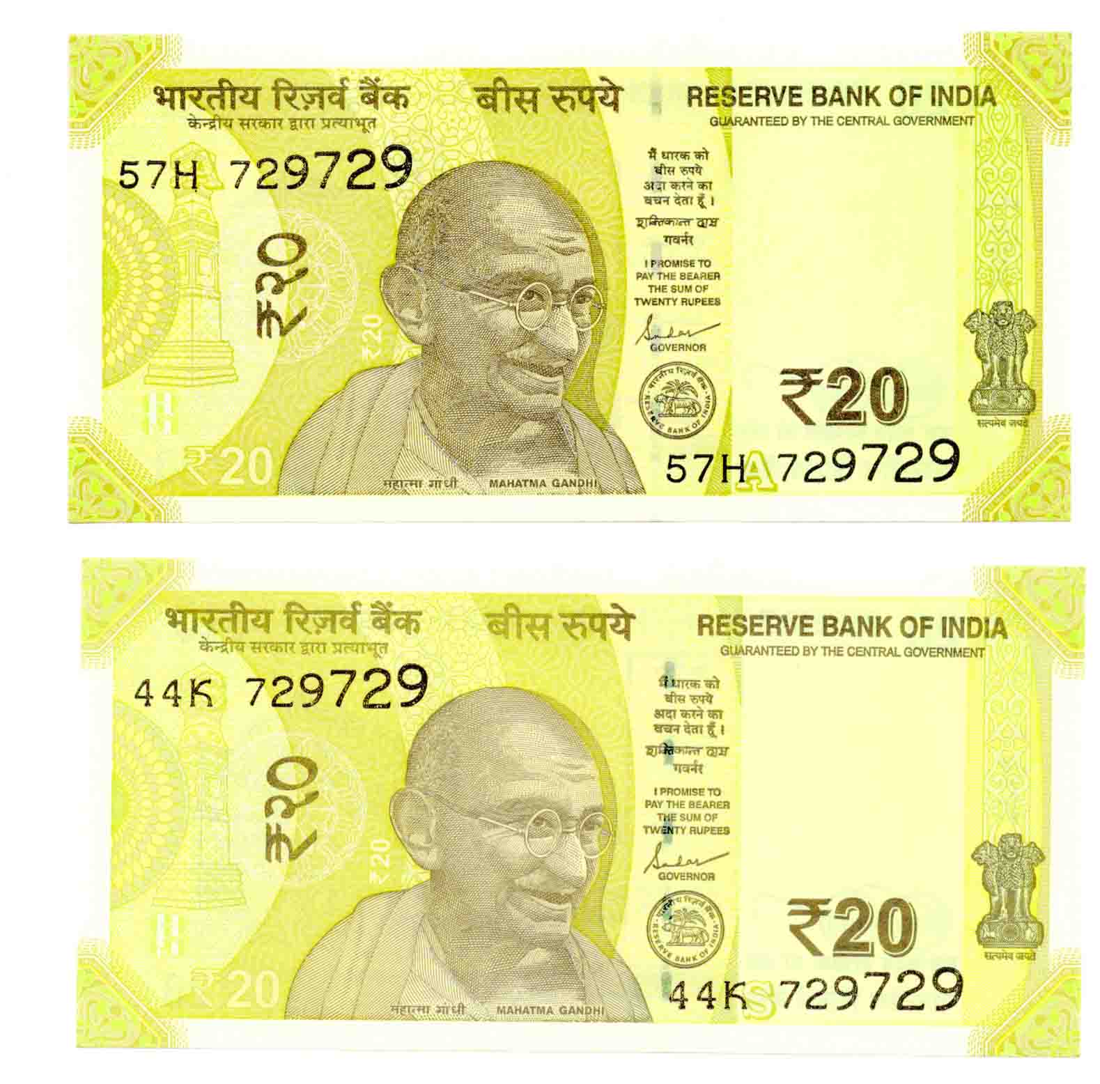 India 20 Rupees Same Serial Number Banknotes ( No :729729)