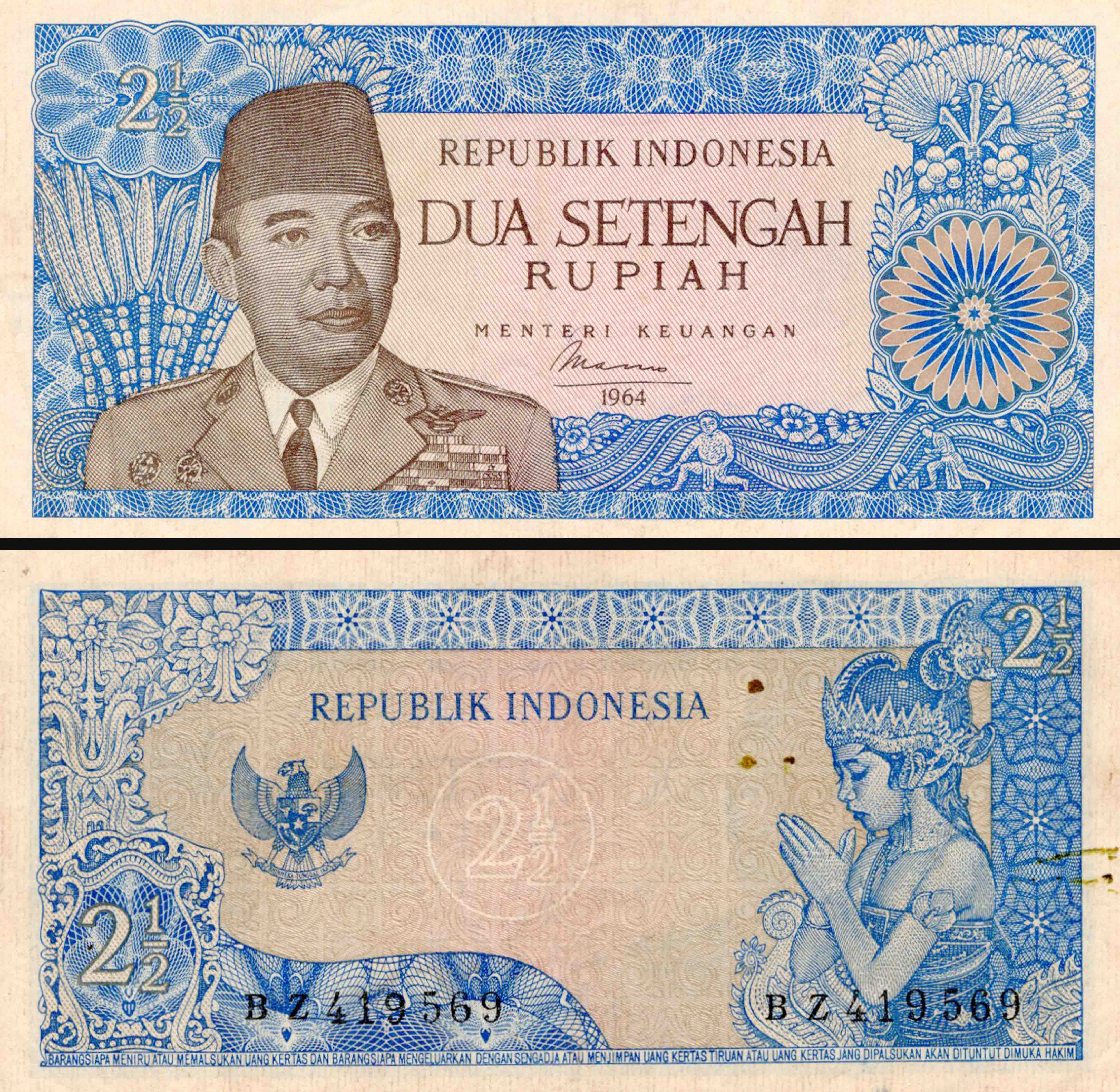 Indonesia 2 1/2 Rupiah Used Banknote