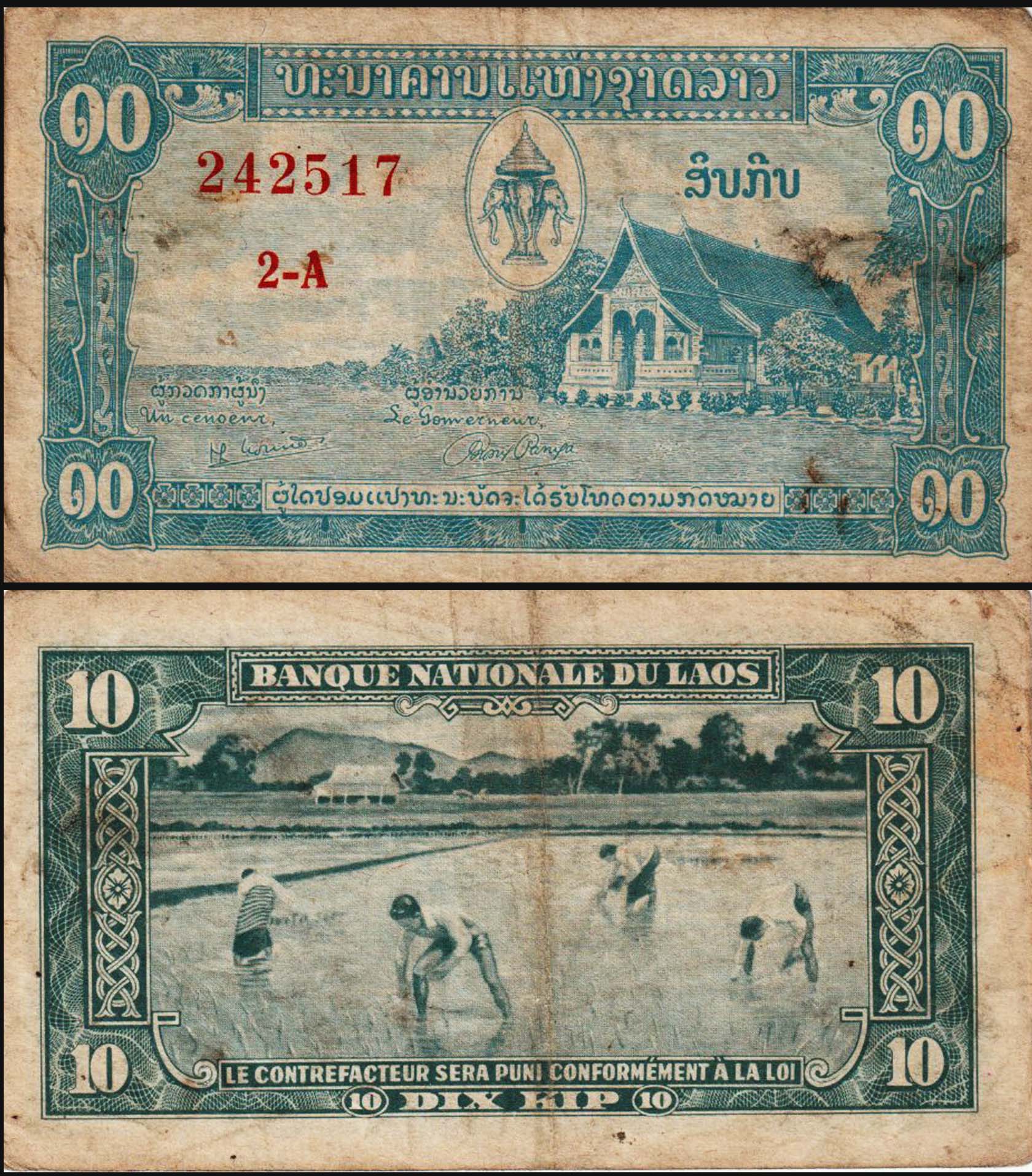 Laos 10 Kip Wat Ong Teu Rice Farmers Very Used Banknote