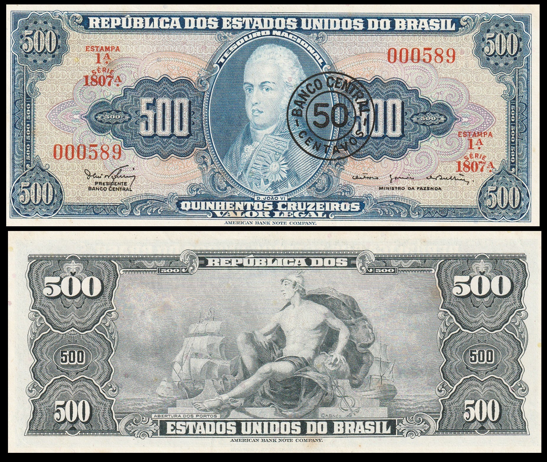 Brazil Centavos On 500 Cruzeiros Used Banknote