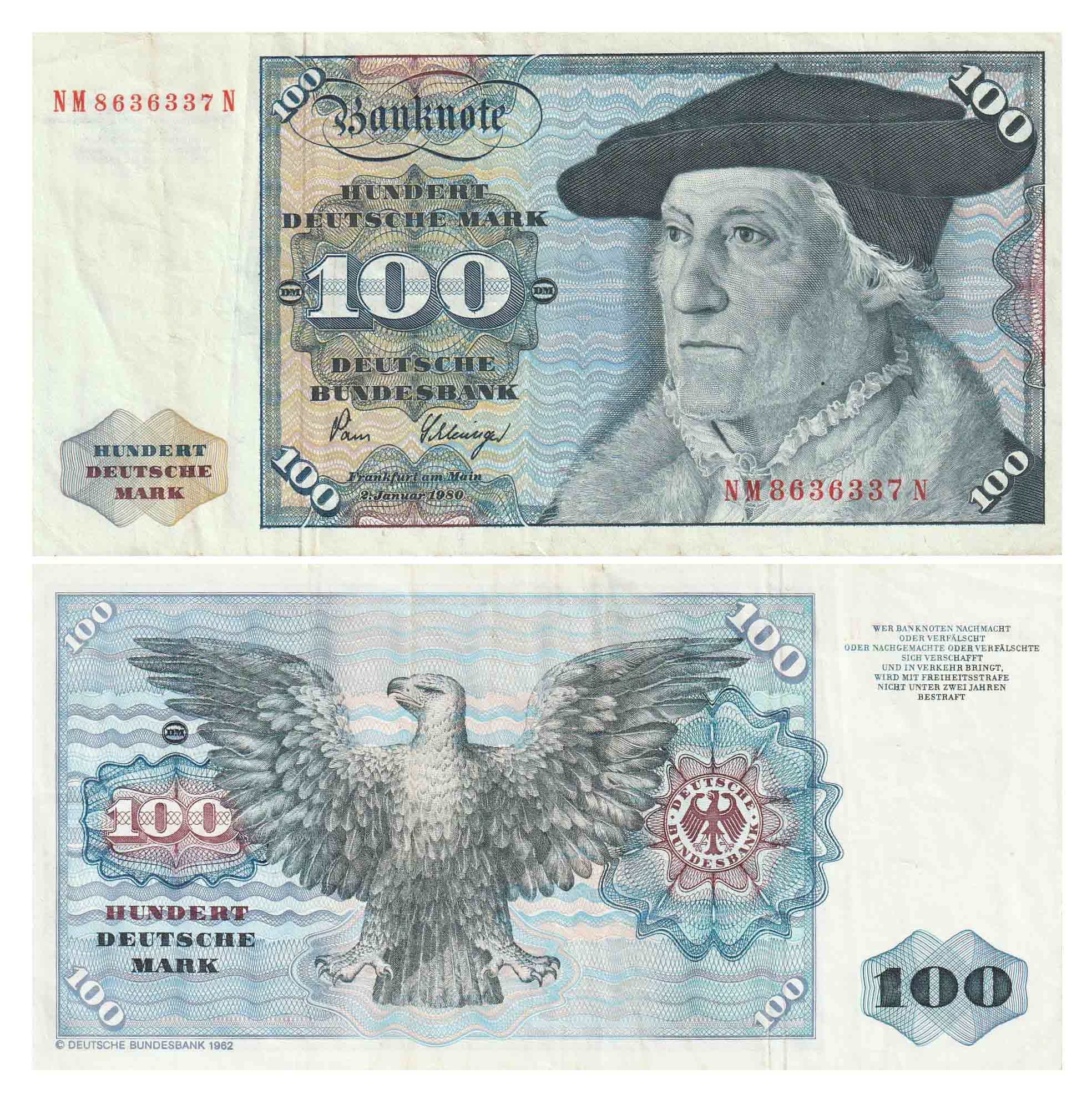 Germany 100 Deutsche Mark 1980 - Federal Republic Used Banknote.