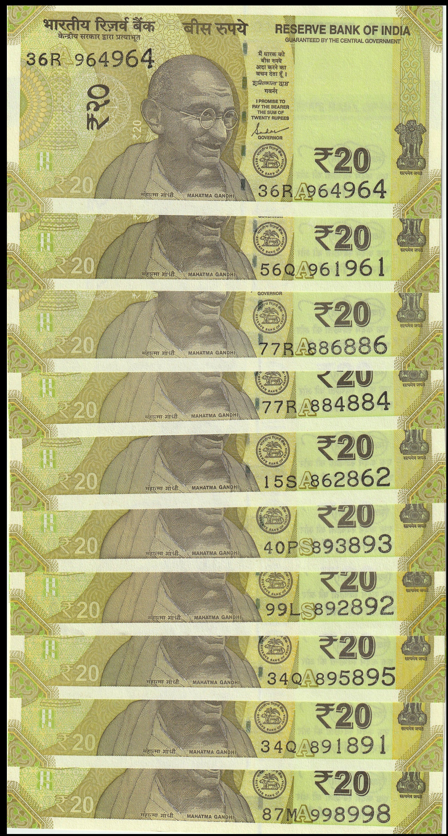 India 20 Rupees Governor Shaktikanta Das Fine Banknote 10 Pcs (302)