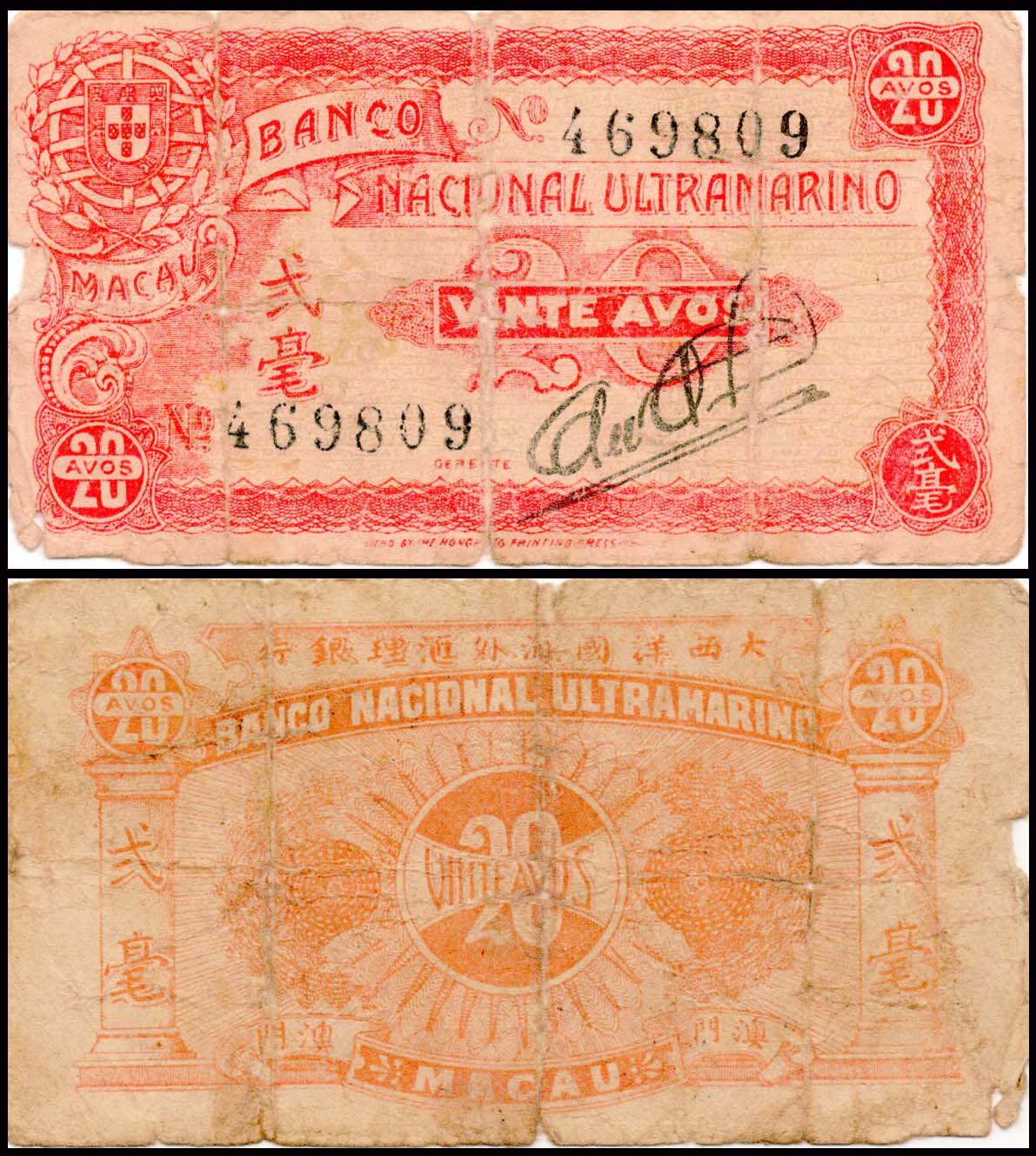Macau 20 Avos Banco Nacional Ultramarino Very Used & Damaged Banknote M98