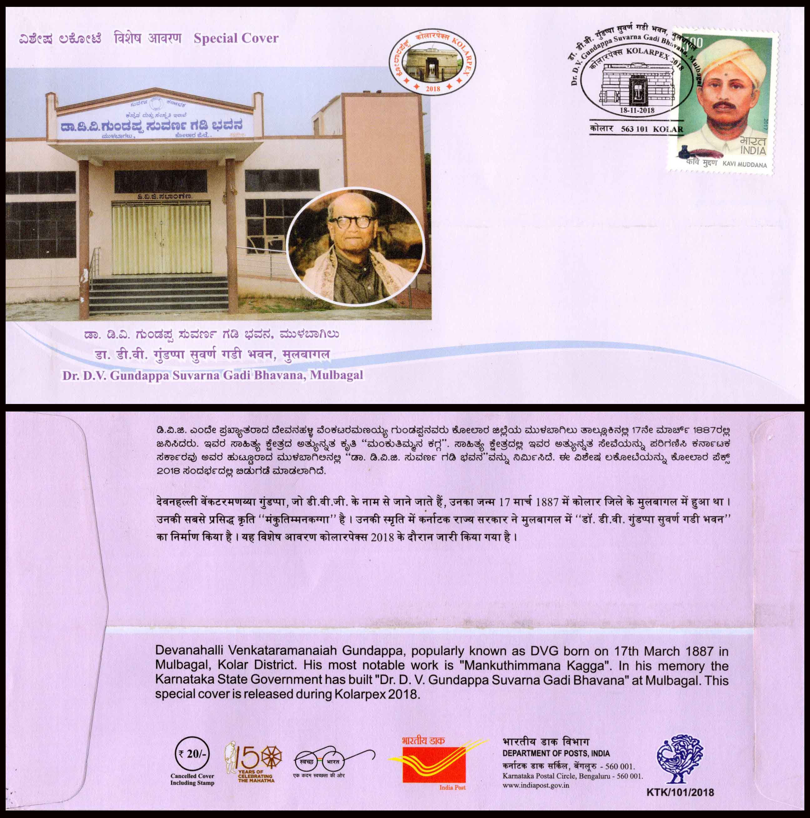 India Dr.D.V.Gundappa Suvarna Gadi Bhavan Archite Special Cover