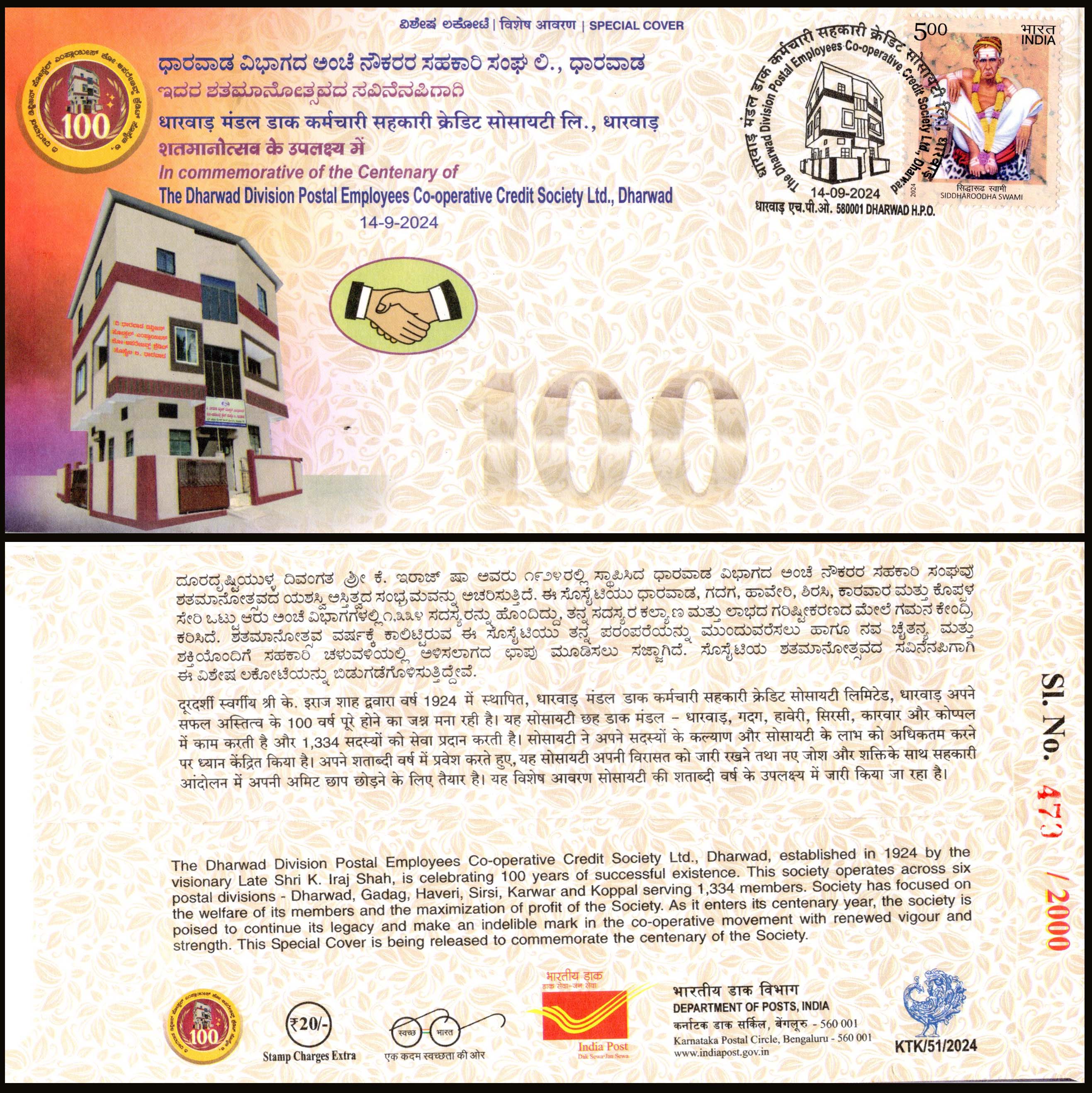 India The Dharwad Division Postal Employees Co operative Credit Society Limited Dharwad Special Cover