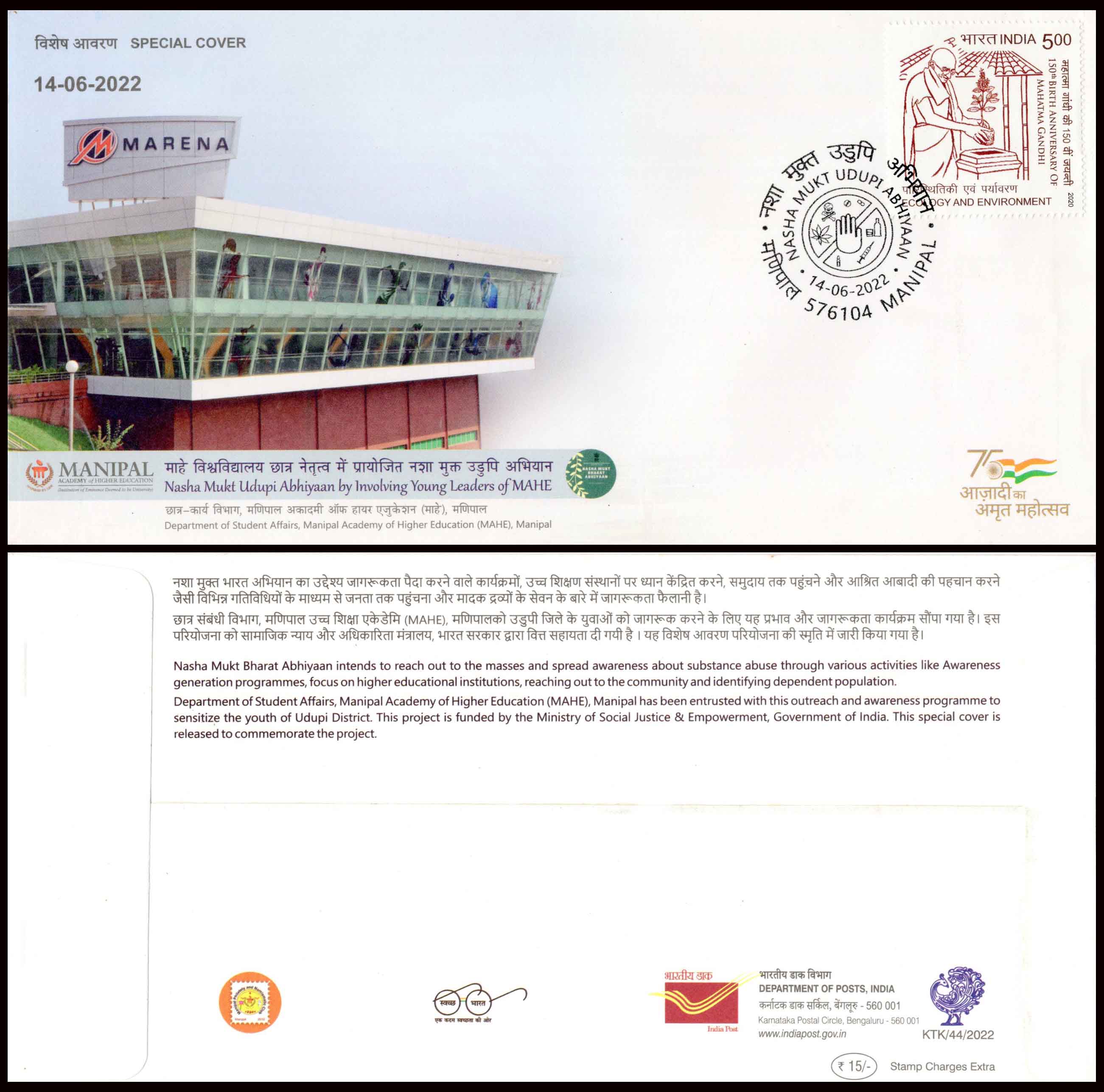 India Nasha Mukt Udupi Abhiyaan from Manipal Karnataka Special Cover