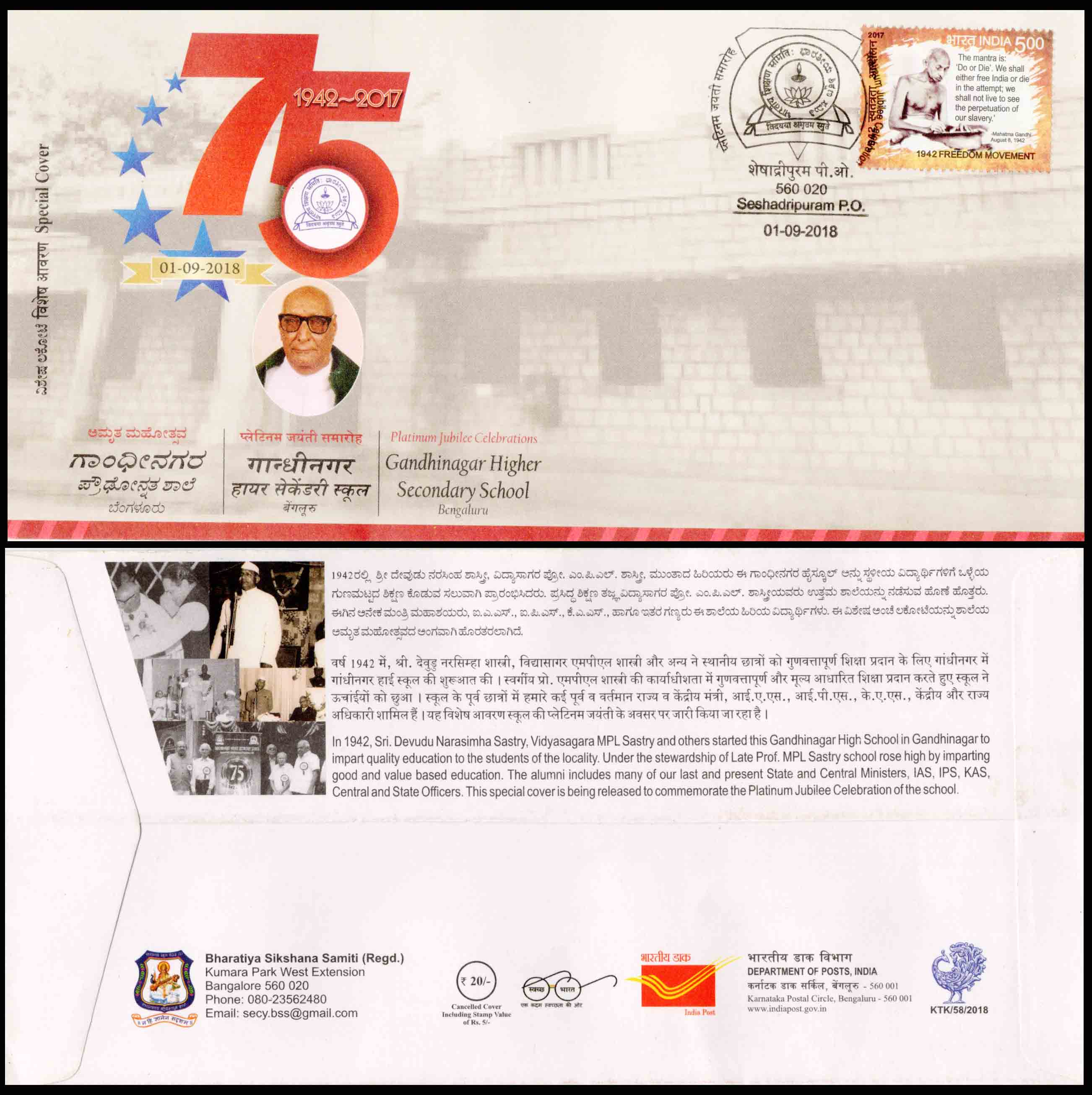 India 75th Gandhinagar Higher Secindary School - Seshadripuram Special Cover