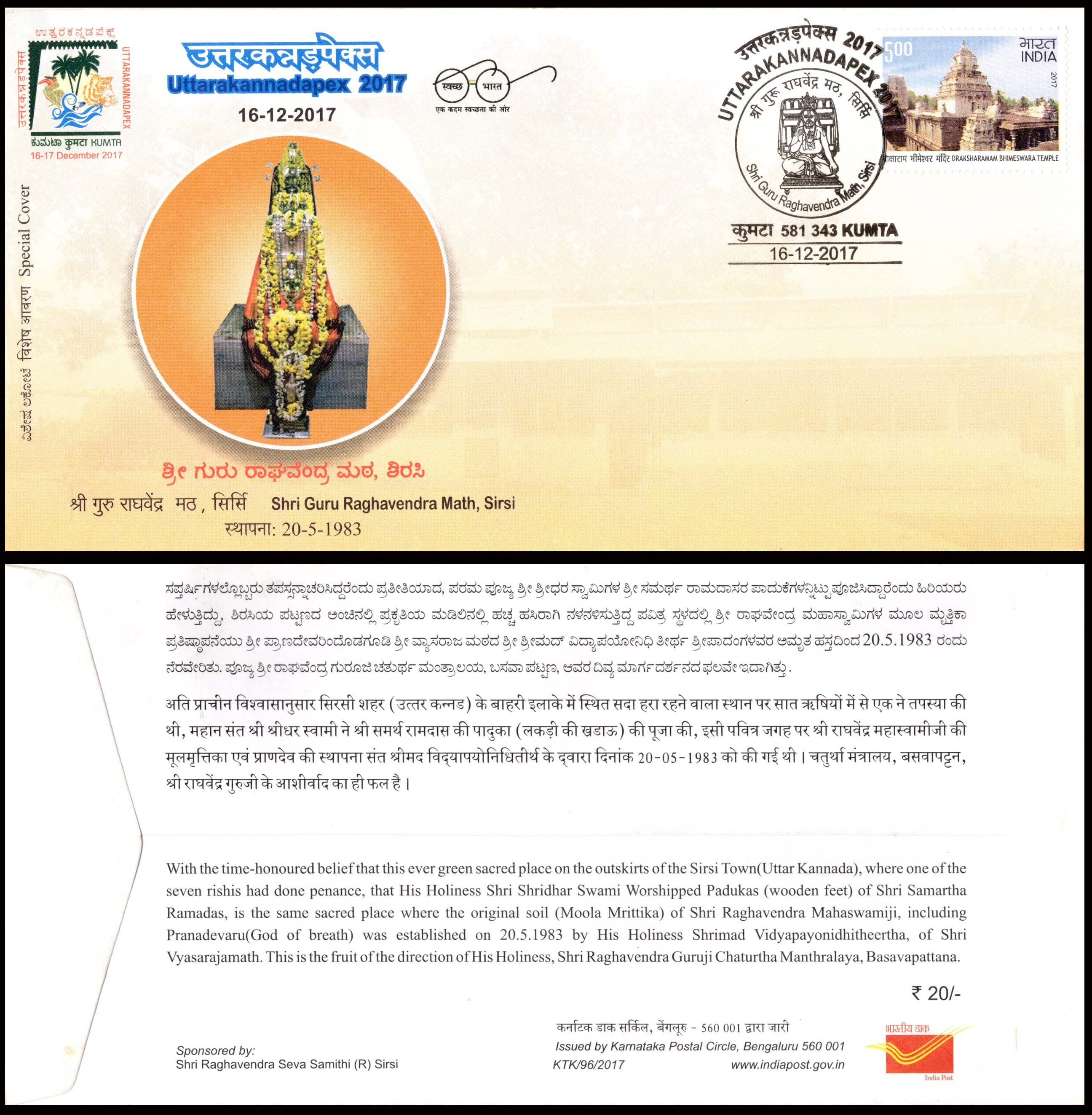 India Shri Guru Raghavendra Math Sirsi Special Cover