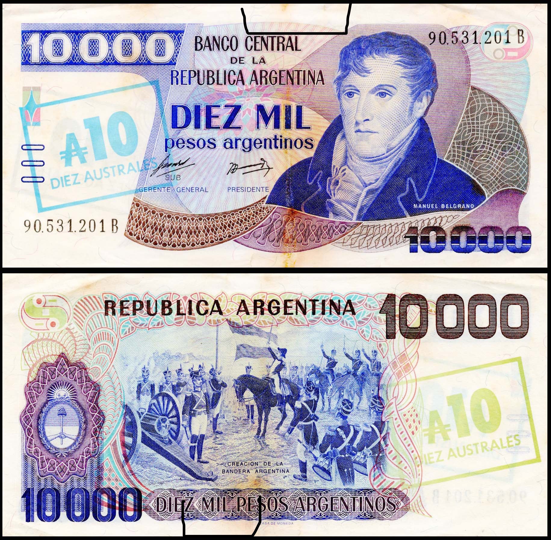 Argentina 10 Australes Overprint on 10000 Pesos Argentinos Used & Damaged Banknote M157