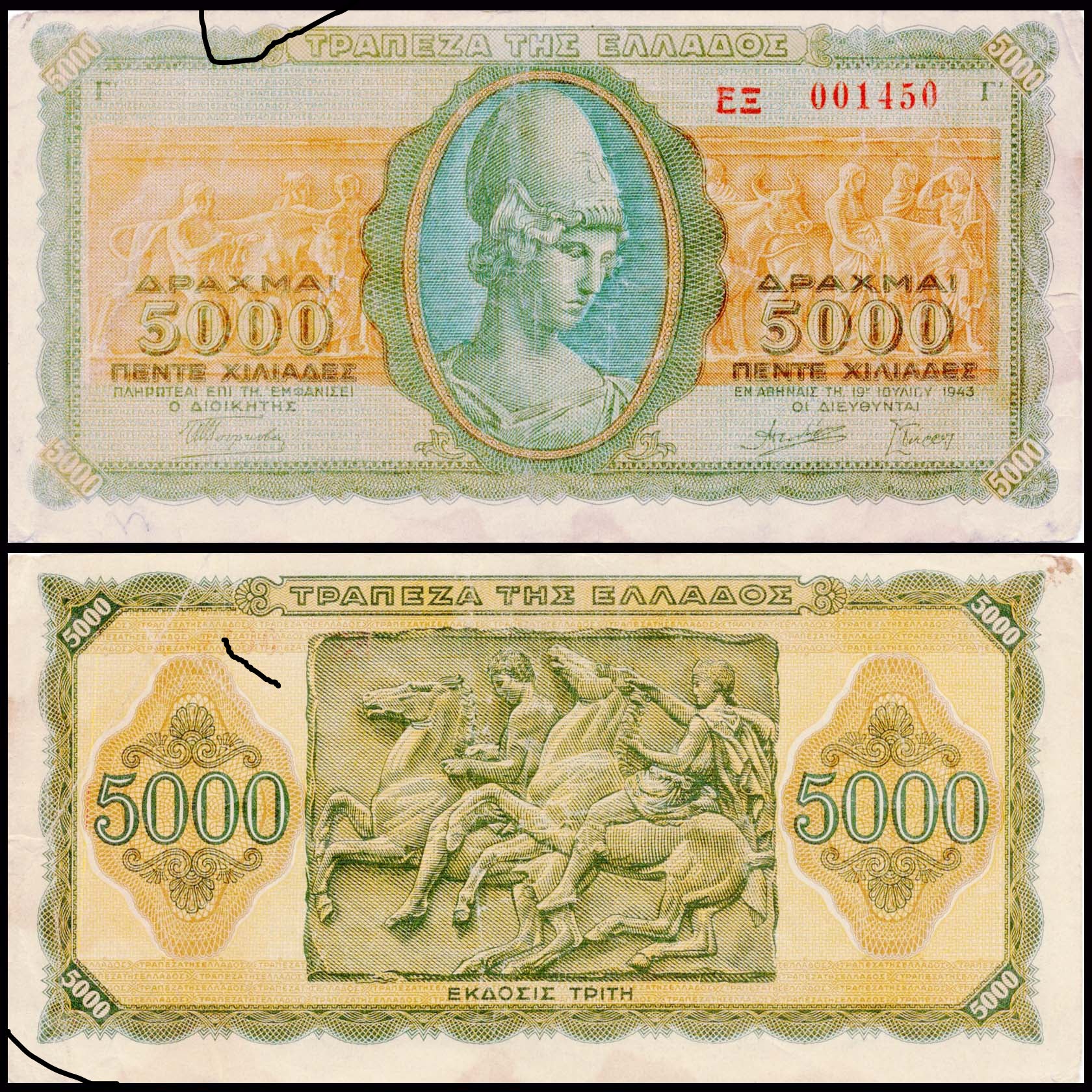 Greece 5000 Drachmai Used & Damaged Banknote