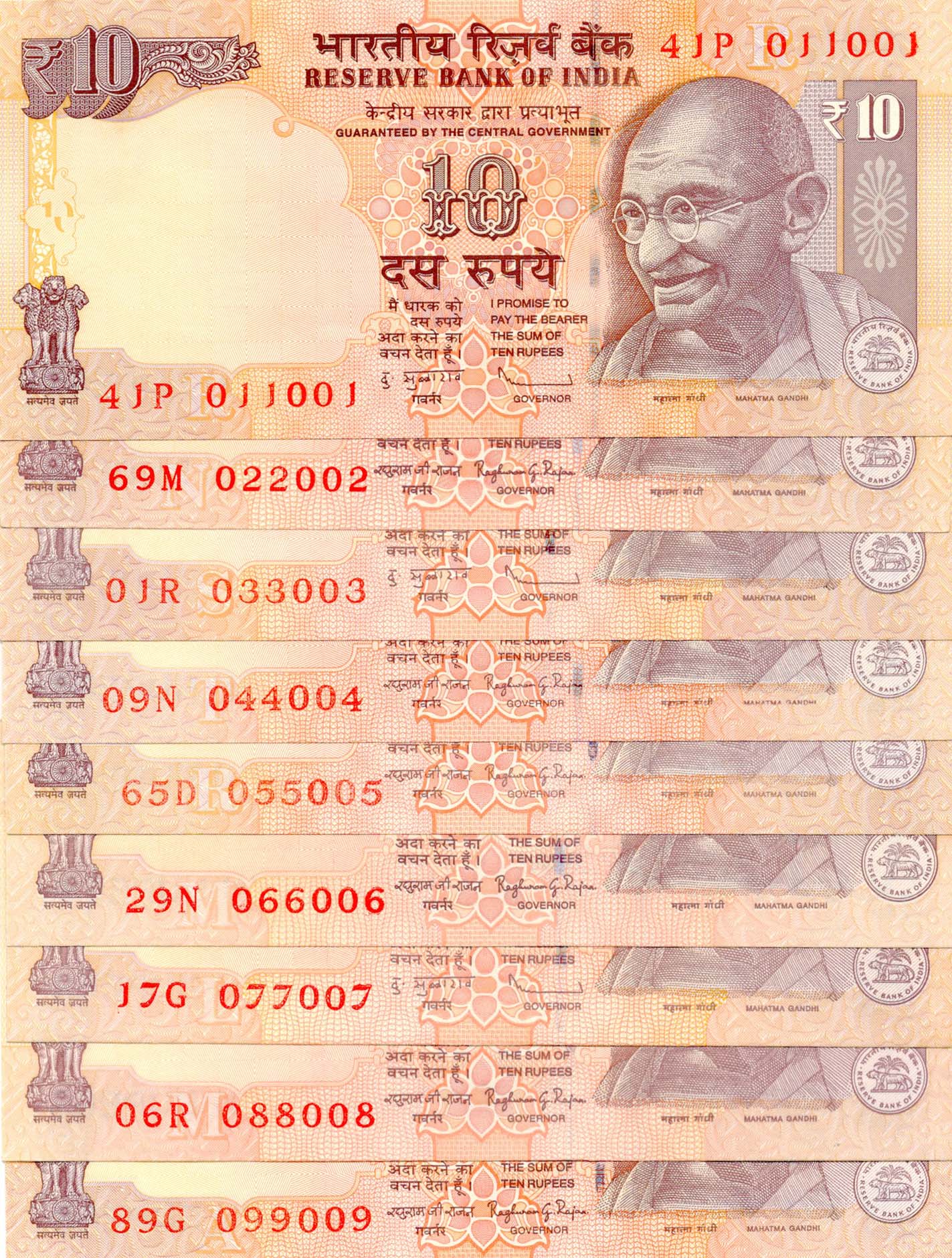 India 10 Rupees Semi Fancy Number UNC Banknotes 9 pcs