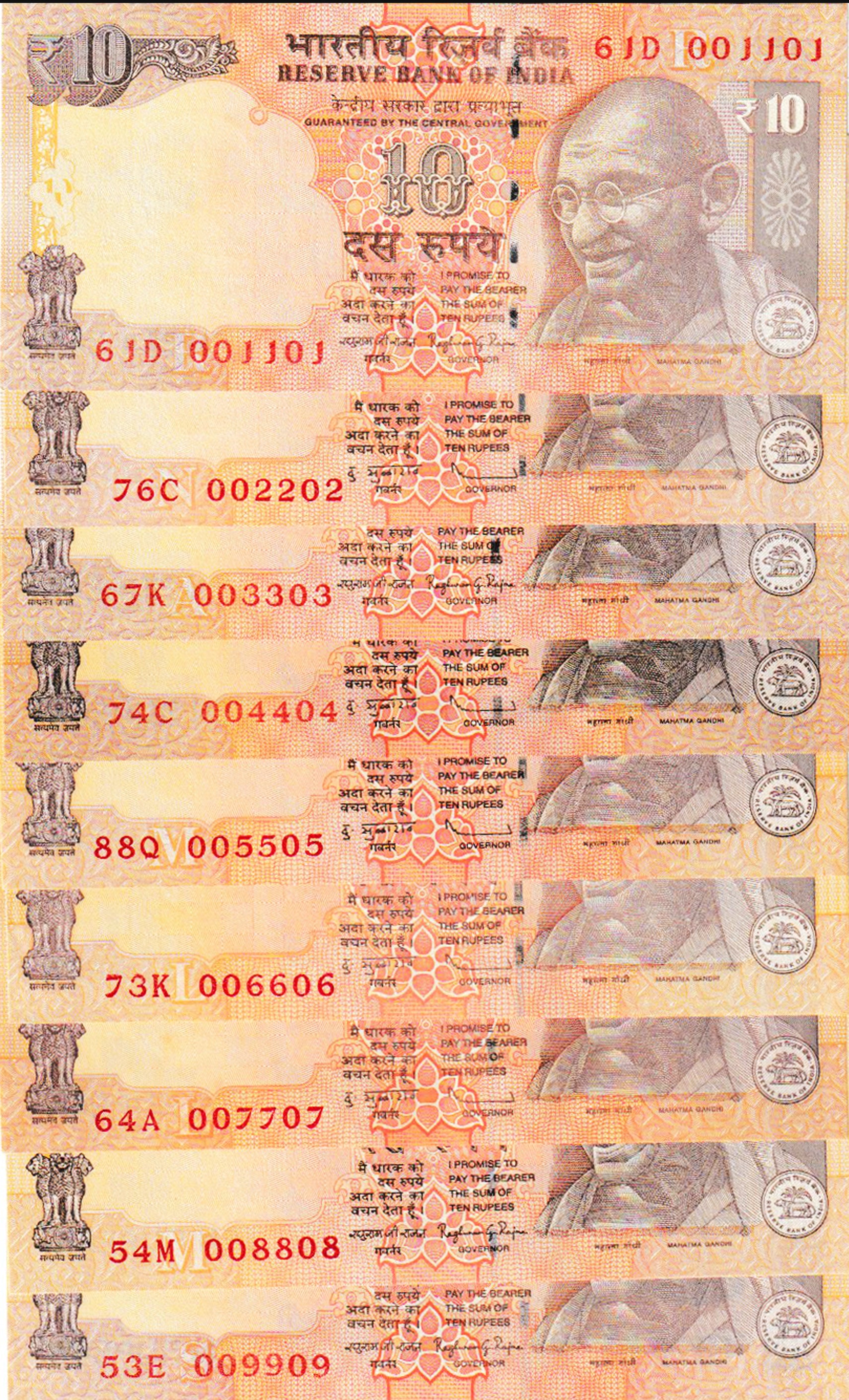 India 10 Rupees Semi Fancy Numbers UNC Banknote 9 pcs .