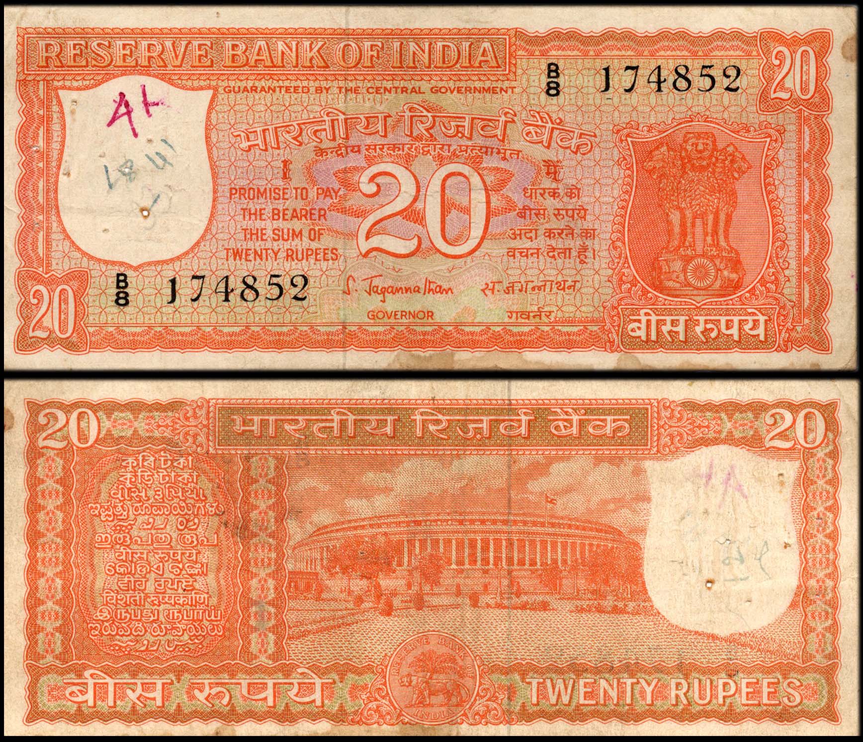 India 20 Rupees Governor S.Jagannathan Used Banknote