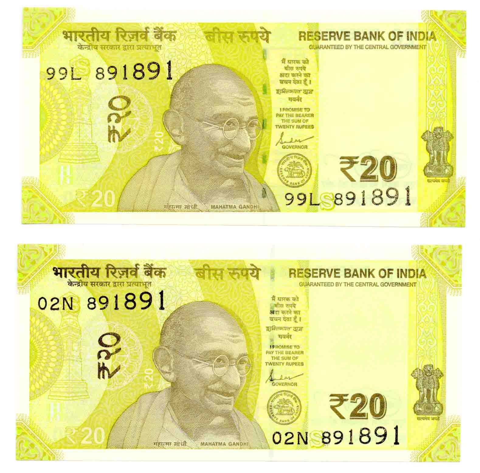 India 20 Rupees Same Serial Number Banknotes ( No :891891)