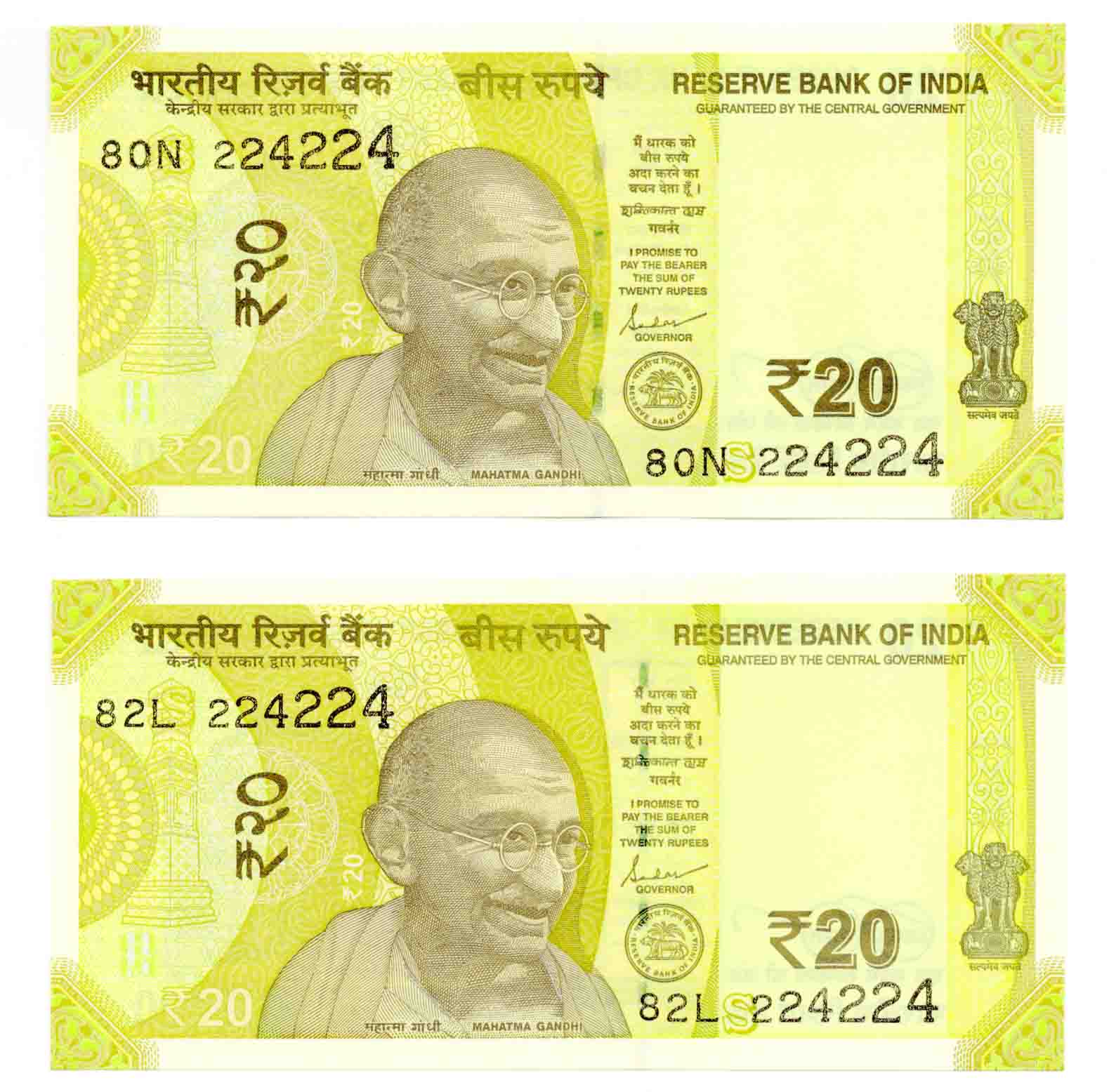India 20 Rupees Same Serial Number Banknotes ( No :224224)