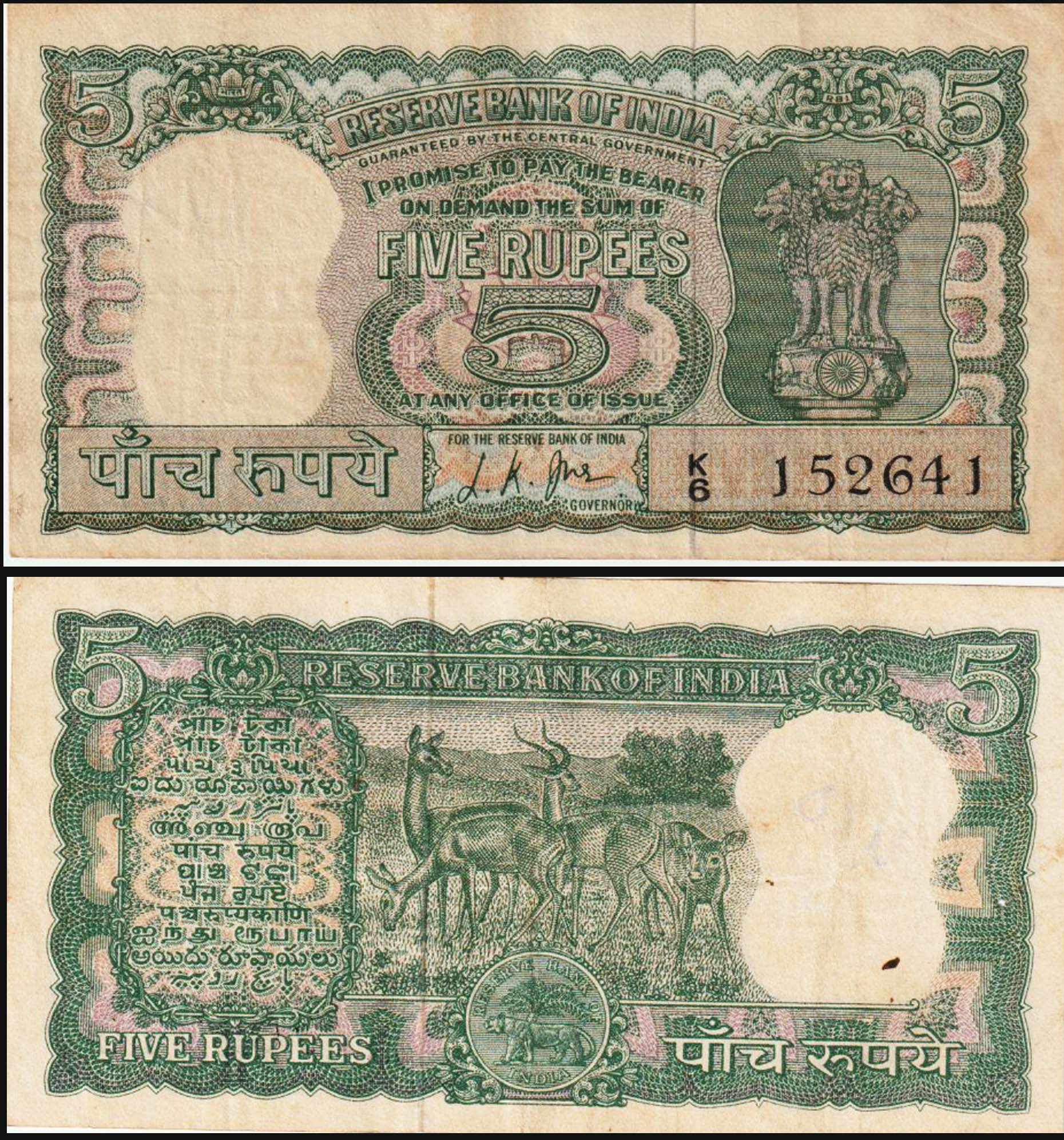 India 5 Rupee K Used Banknote 4 deer note