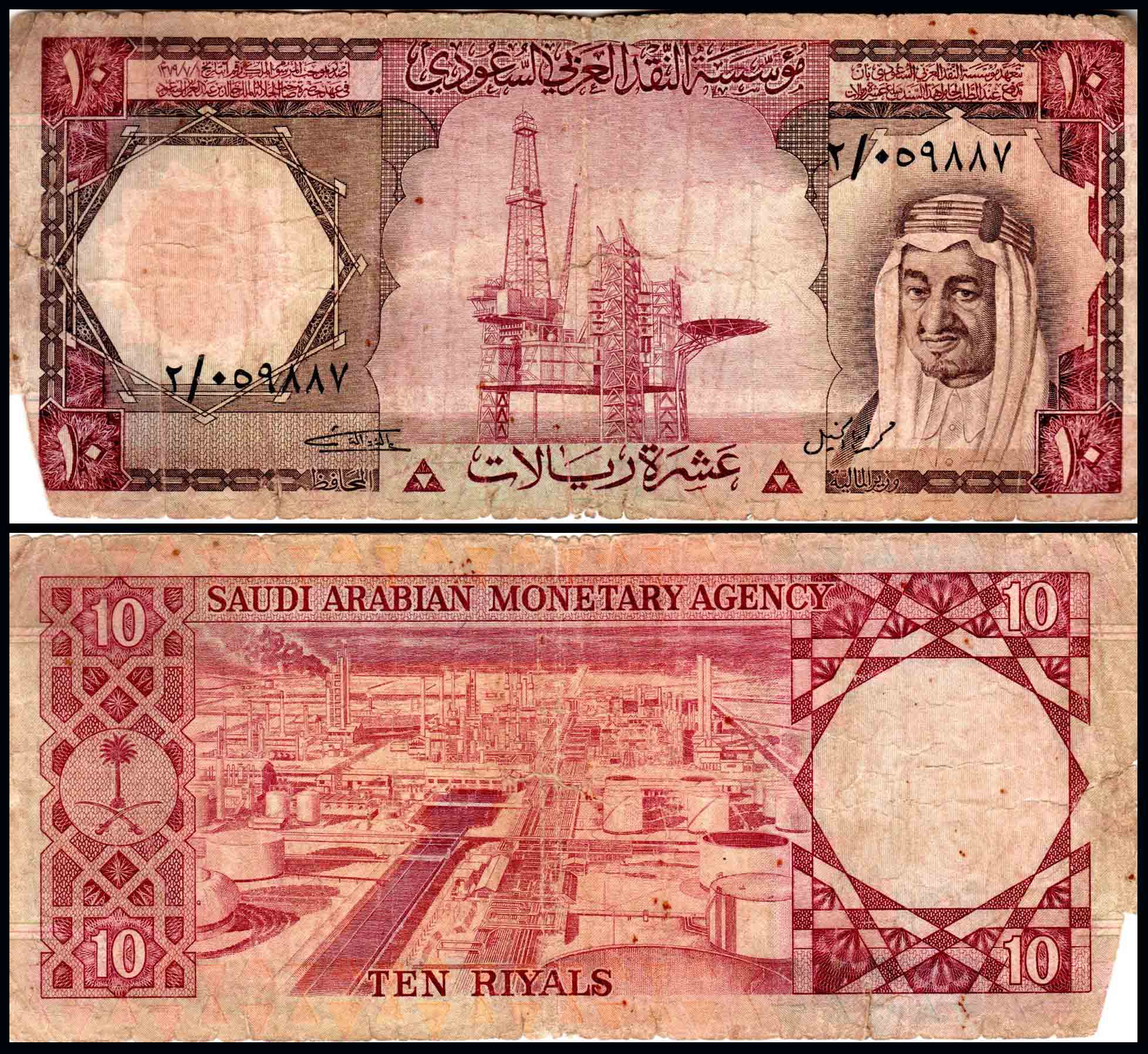 Saudi Arabia 10 Riyals King Faisal Very Used & Damaged Banknote