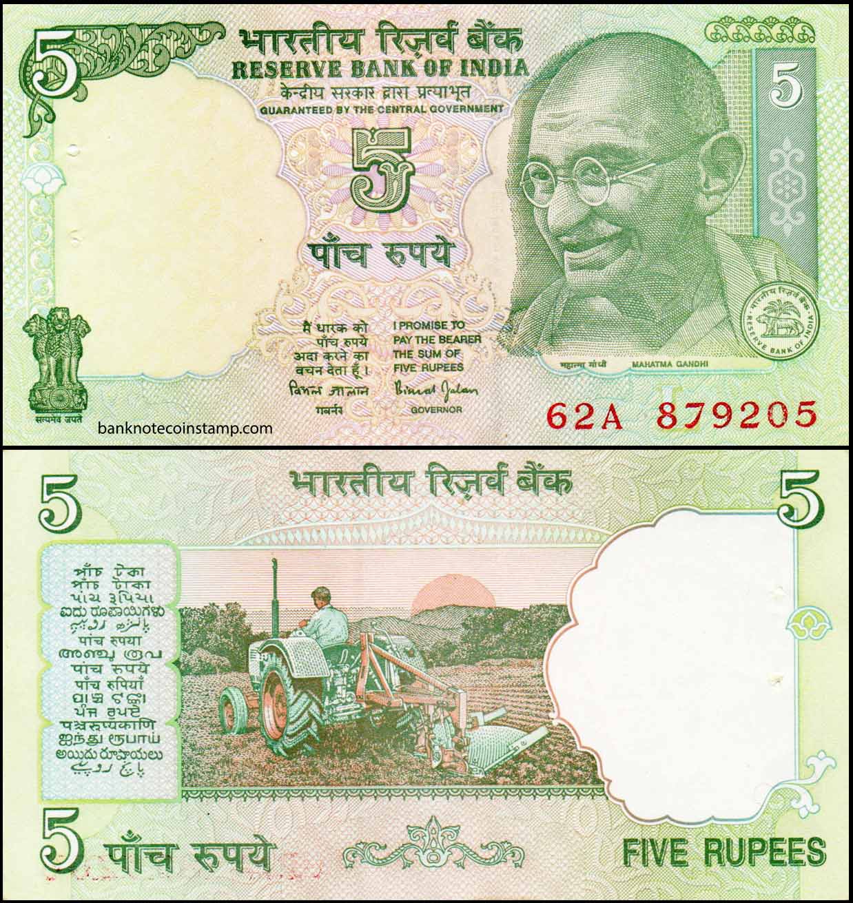 India 5 Rupees Governor Bimal Jalan Used Banknote