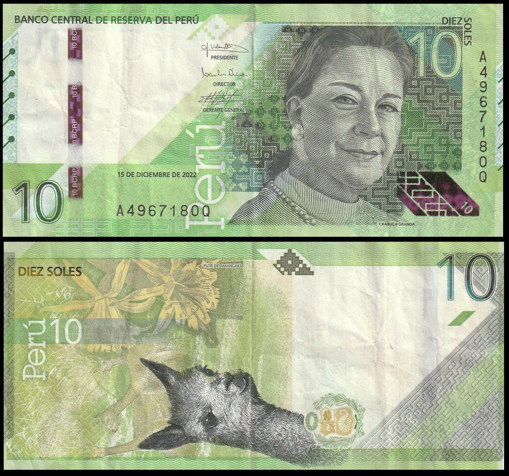 Peru 10 Soles (2022) Used Banknote – Chabuca Granda, Vicuña & Amancaes Flower